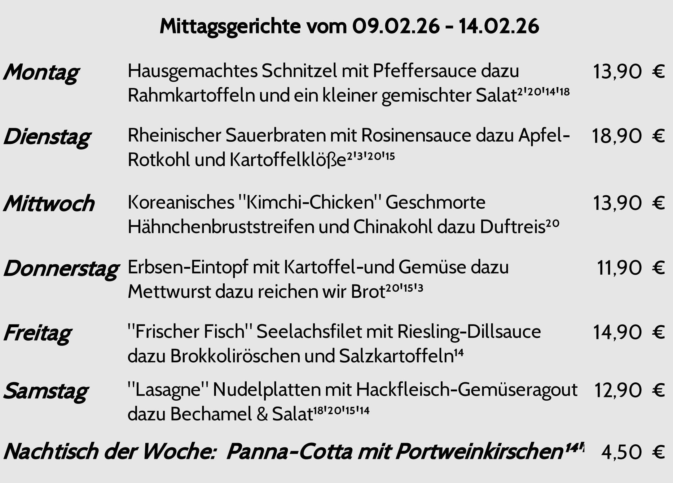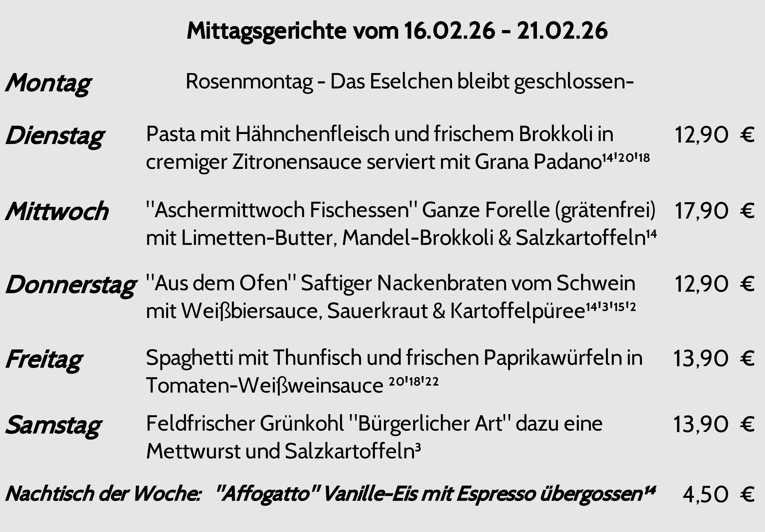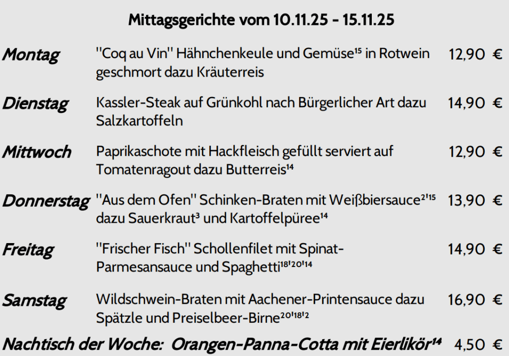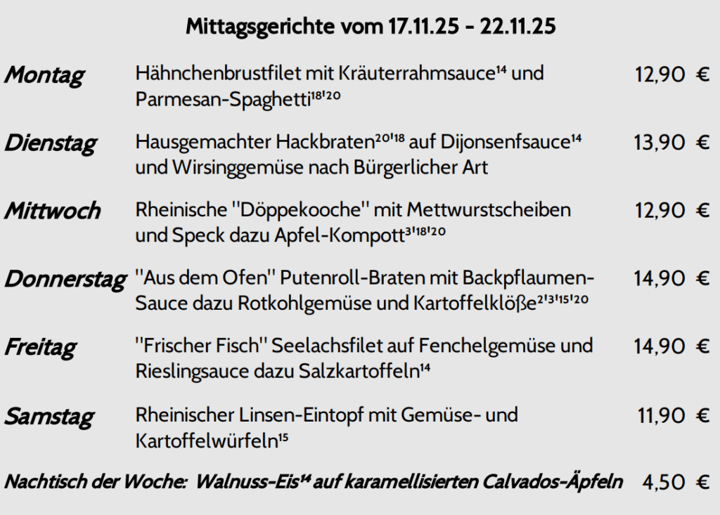 Diese wöchentlich wechselnde Speisekarte senden wir Dir auch gerne vorab per E-Mail, melde Dich bitte hier für unseren 1 x wöchentlich erscheinenden Newsletter an: